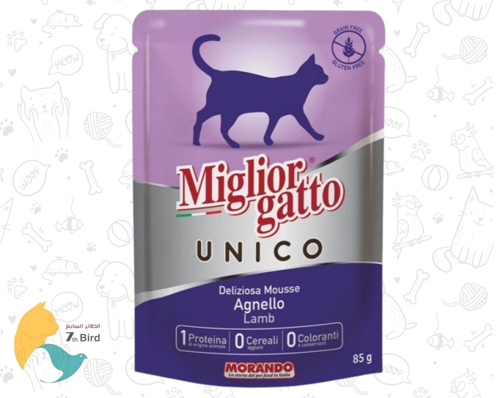 Migliorgatto UNICO هو غذاء فائق الجودة ومتوازن ومناسب للنظام الغذائي اليومي لجميع القطط. فريد من نوعه في نوع البروتين ، فريد في الجودة ، فريد في المذاق.