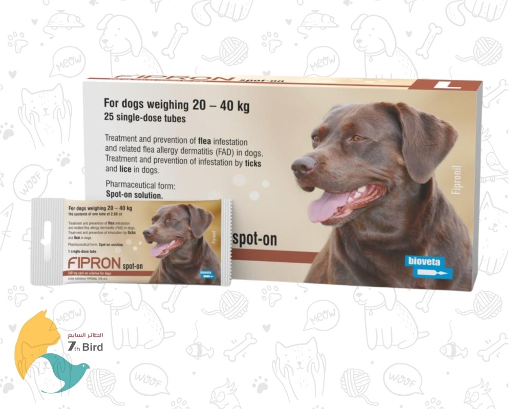 يعتبر FIPRON 268 mg موضعيًا للكلاب فعالًا ضد الإصابة بالبراغيث لمدة شهرين تقريبًا وضد القراد لمدة تصل إلى شهر واحد، اعتمادًا على شدة الإصابة الحيوانية والبيئية.