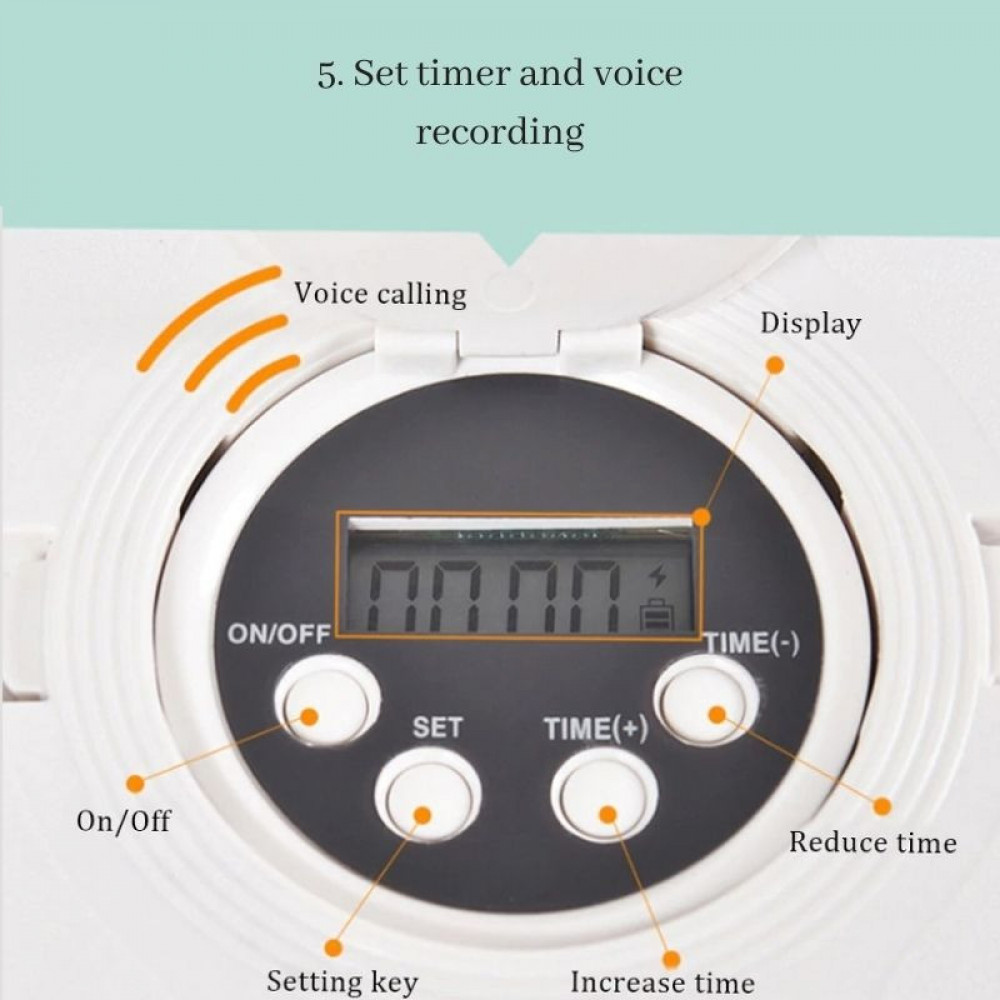 2تصميم بما فيه يتسع ل6وجبات: يمكنك تعيين 6 وجبات في 6 مرات مختلفة مقدما ، ووضع 6 أكوام من الحبوب في 6 شبكات ، مع امكانية وضع خاصية التنبيه الصوتي لكل وجبة