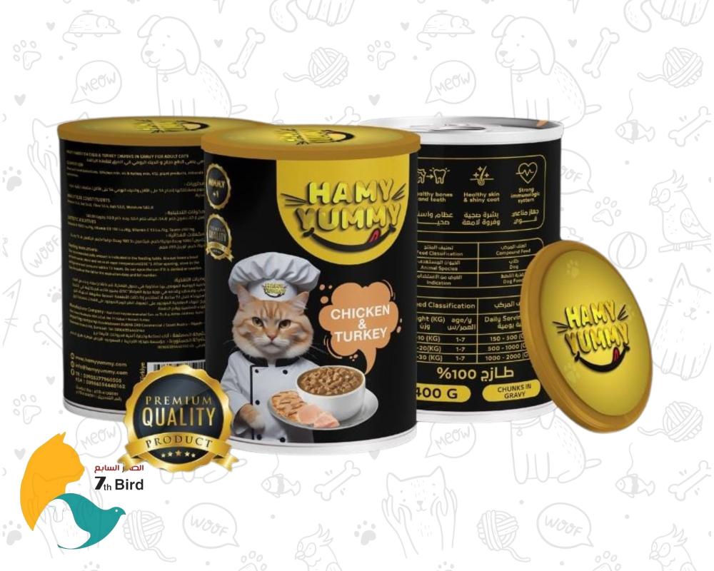 هامي يامي طعام رطب للقطط البالغة بقطع الدجاج و الديك الرومي في المرق 400g